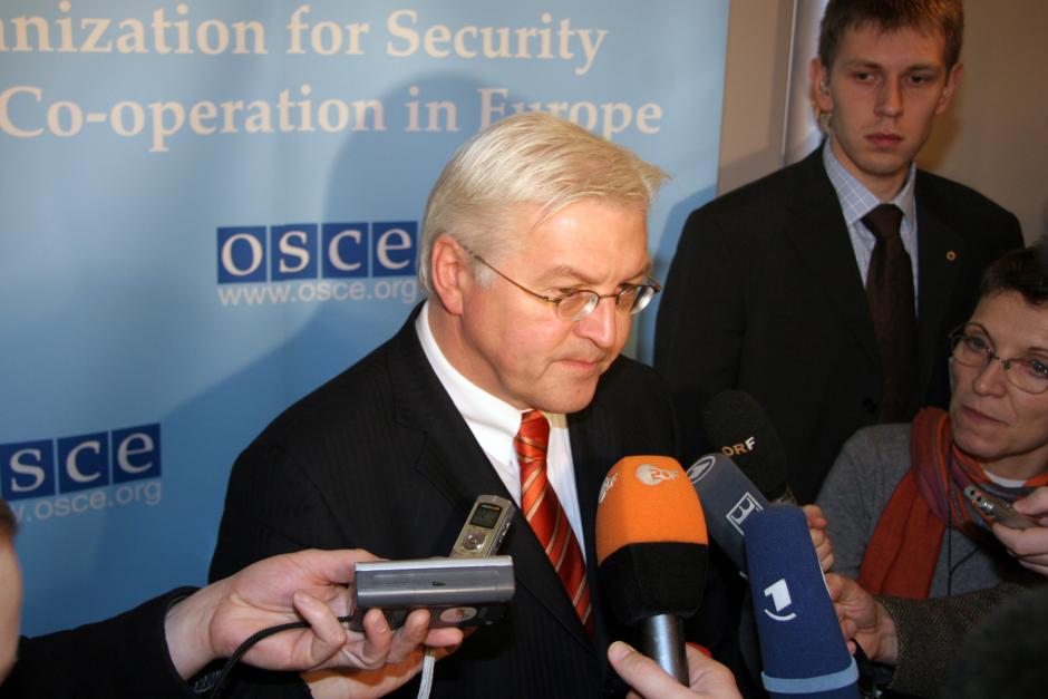 German Foreign Minister Frank-Walter Steinmeier, whose country holds the European Union presidency, speaks to journalists after the OSCE Permanent Council in Vienna, 18 January 2007.