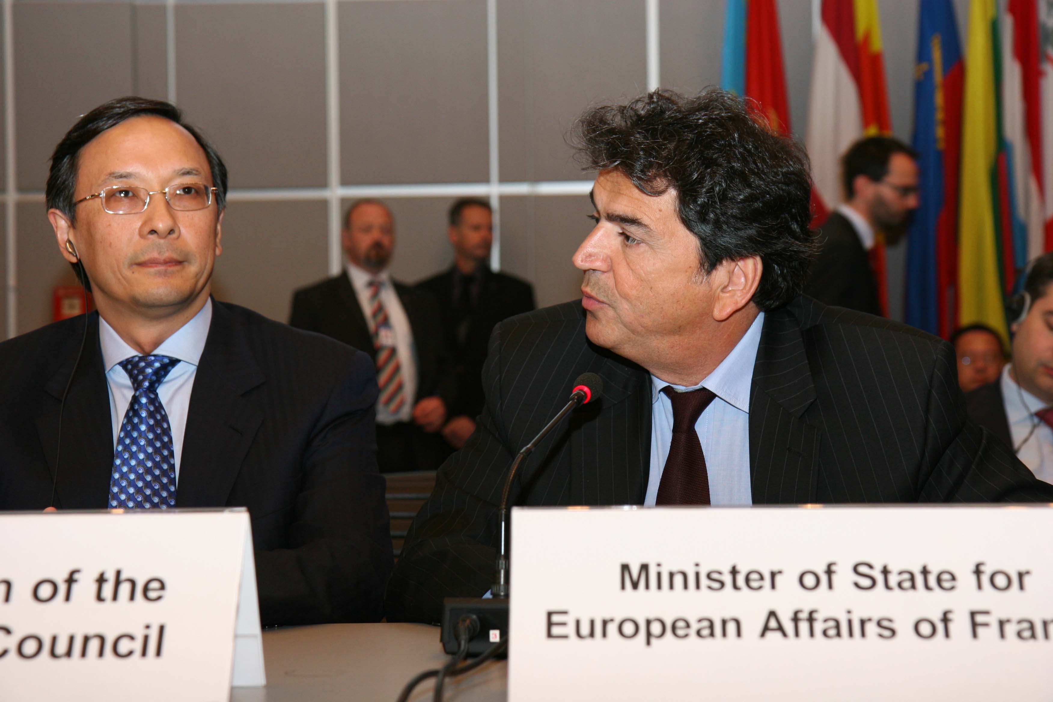 French Minister of State for European Affairs Pierre Lellouche (r) with Kazakh Ambassador Kairat Abdrakhmanov at the OSCE Permanent Council, Vienna, 20 May 2010.
