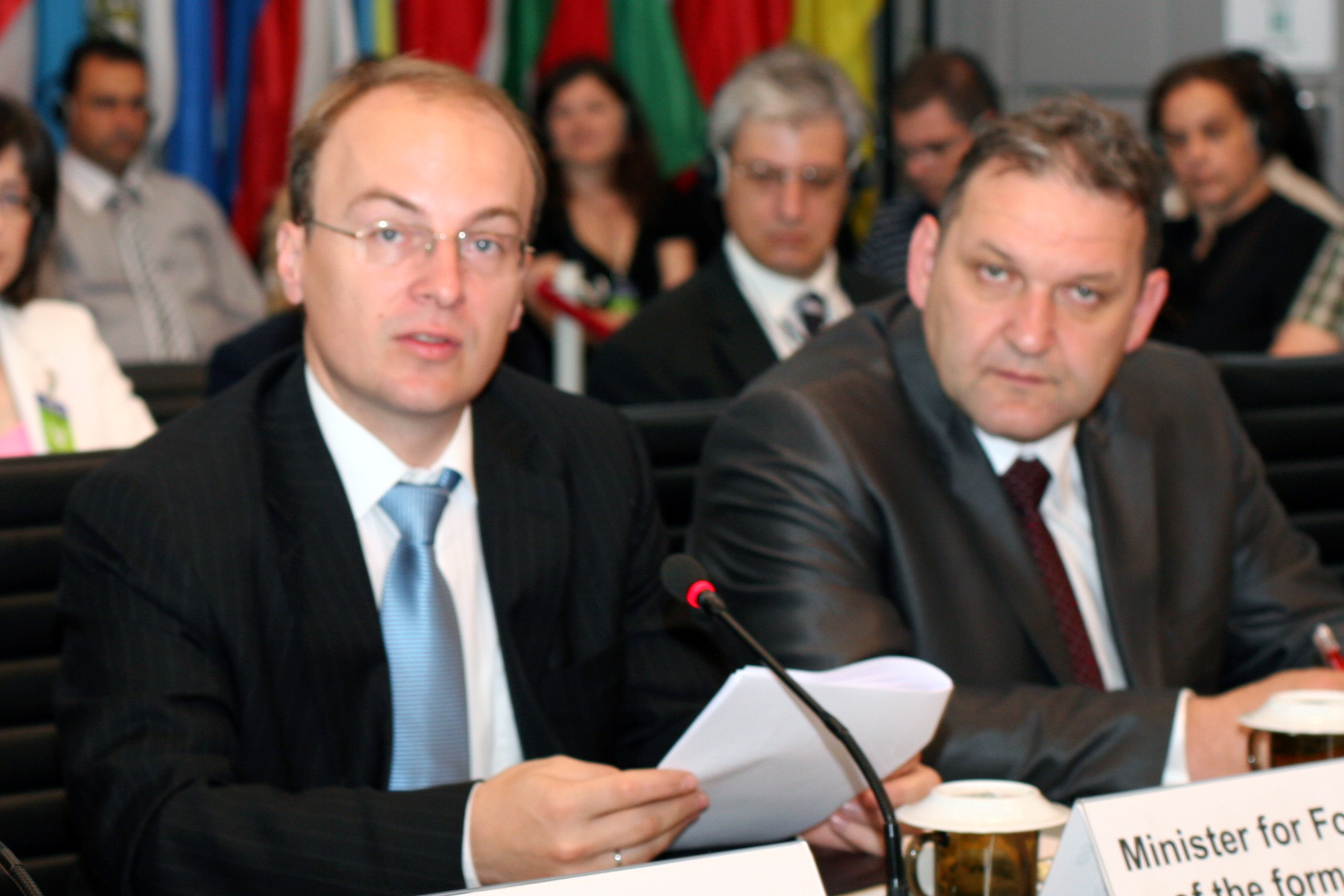 Minister of Foreign Affairs of the Former Yugoslav Republic of Macedonia Antonio Milososki (l) addresses the OSCE Permanent Council, Vienna, 10 June 2010
