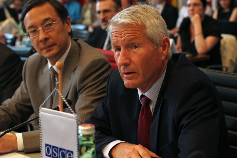 Secretary General of the Council of Europe Thorbjorn Jagland (r) addresses the OSCE Permanent Council, Vienna, 1 July 2010.