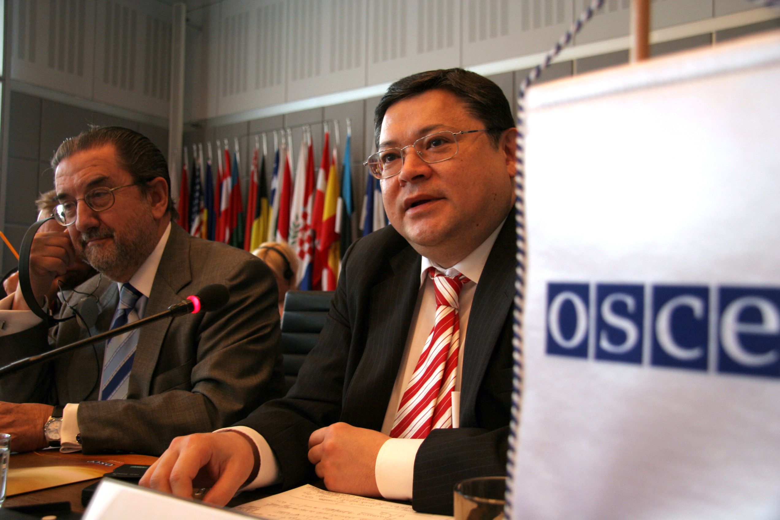 Kazakh Foreign Minister Marat Tazhin (right) speaks to the OSCE Permanent Council in Vienna, 30 April 2007, as Chairman of the Permanent Council, Ambassador Carlos Sanchez de Boado of Spain, looks on.
