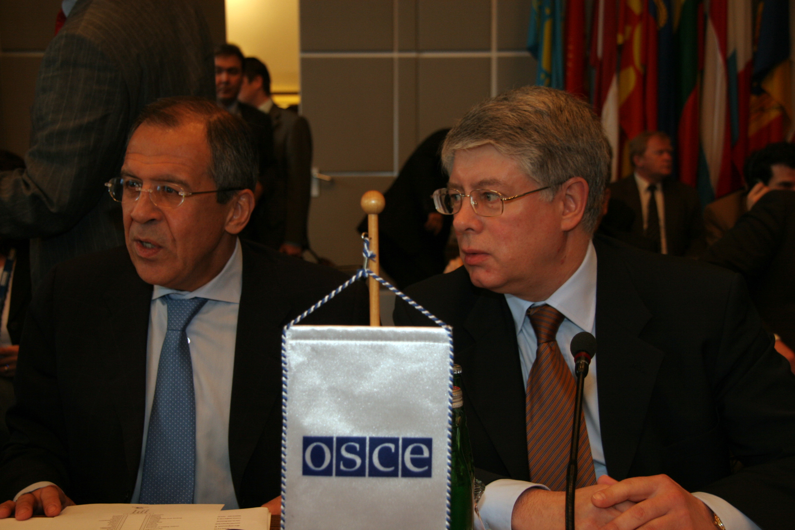 Russian Foreign Minister Sergey Lavrov (left) delivers a speech to the OSCE Permanent Council, in Vienna 23 May 2007, as Ambassador Alexey Borodavkin looks on.