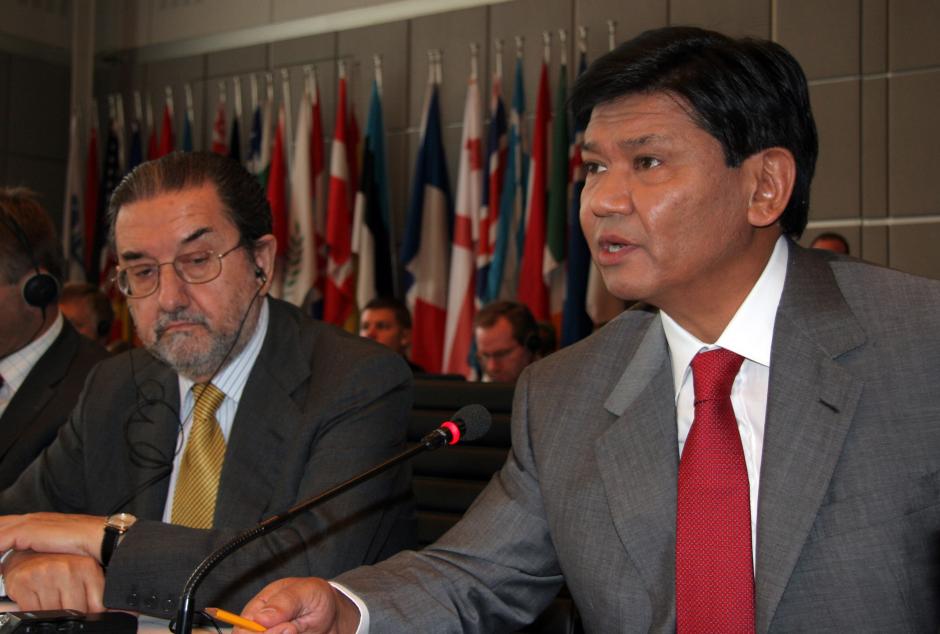 Yermukhamet Yertysbayev (right), Minister of Culture and Information of Kazakhstan, speaks to the OSCE Permanent Council in Vienna, 26 July 2007, as Ambassador Carlos Sanchez de Boado of Spain looks on.