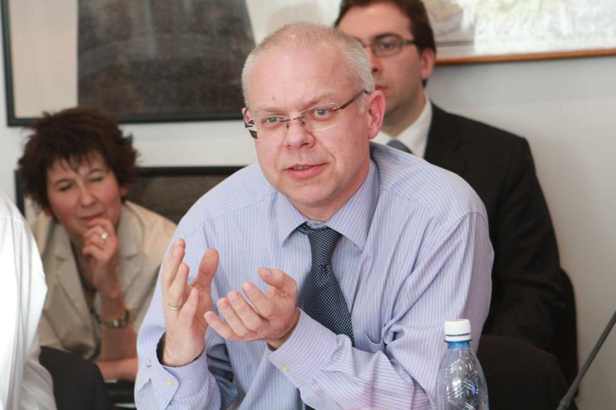 Ambassador Renatas Norkus, Permanent Representative of Lithuania to the OSCE and Chairperson of the Permanent Council, speaks at a briefing at the OSCE Centre in Bishkek, 7 April 2011.