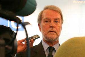 The Head of the Finnish OSCE Chairmanship Task Force, Ambassador Aleksi Harkonen, speaking to journalists after a special meeting of the Permanent Council in Vienna, 18 August 2008.