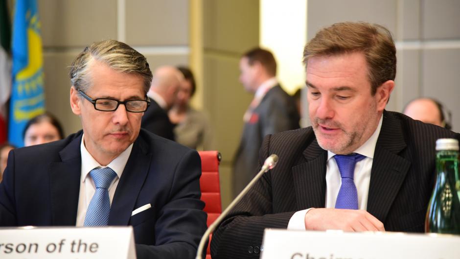 Ambassador Radomír Boháč, Chairperson of the Forum for Security Co-operation and Slovakia’s Permanent Representative to the OSCE (l), and Ambassador Alessandro Azzoni, Chairperson of the OSCE Permanent Council and Italy’s Permanent Representative to the OSCE at the joint meeting of the Forum for Security Co-operation and the Permanent Council, Vienna, 14 February 2018.