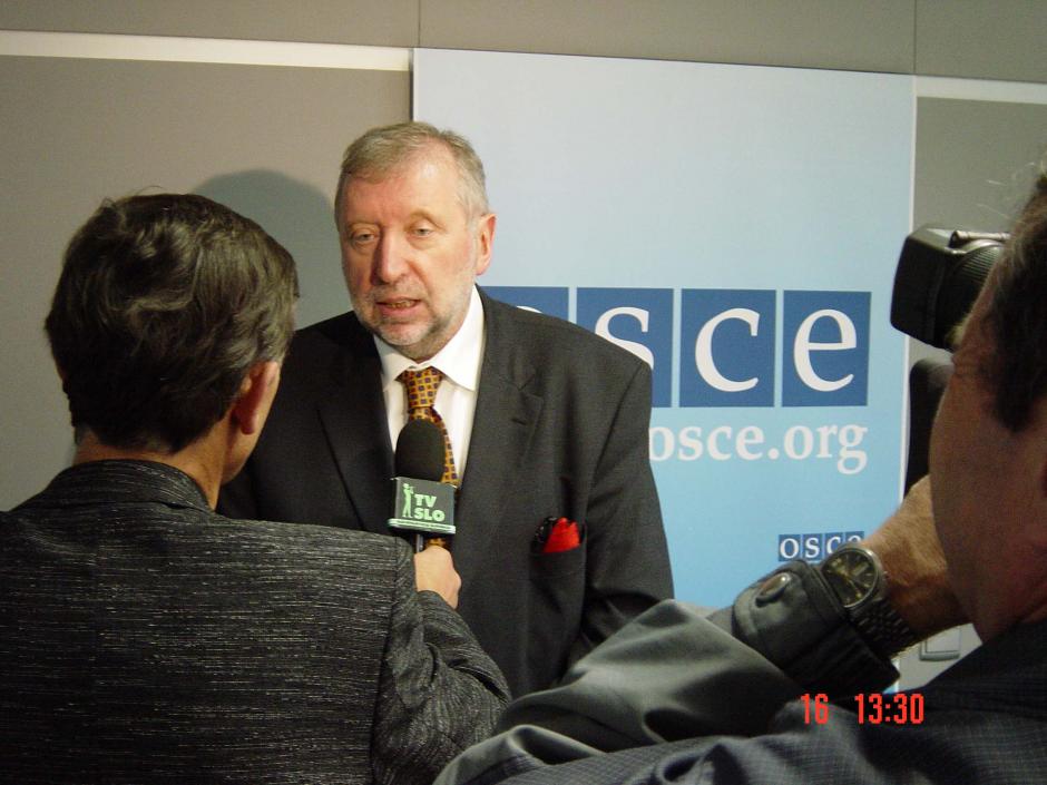 OSCE's Chairman-in-Office in 2005, Slovenian Foreign Minister Dimitrij Rupel, gives an interview after the OSCE Troika meeting, Vienna, 16 January 2004.