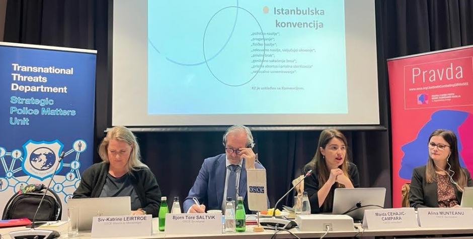 Siv-Katrine Leirtroe, Deputy Head of Mission to Montenegro, Bjorn Tore Saltvik, Adviser on Police Reform in TNTD, Maida Cehajic-Campara, OSCE consultant and Alina Munteanu, Associate Project Officer, at the workshop for law enforcement on gender-based violence in Podgorica, Montenegro, 29 November 2022.