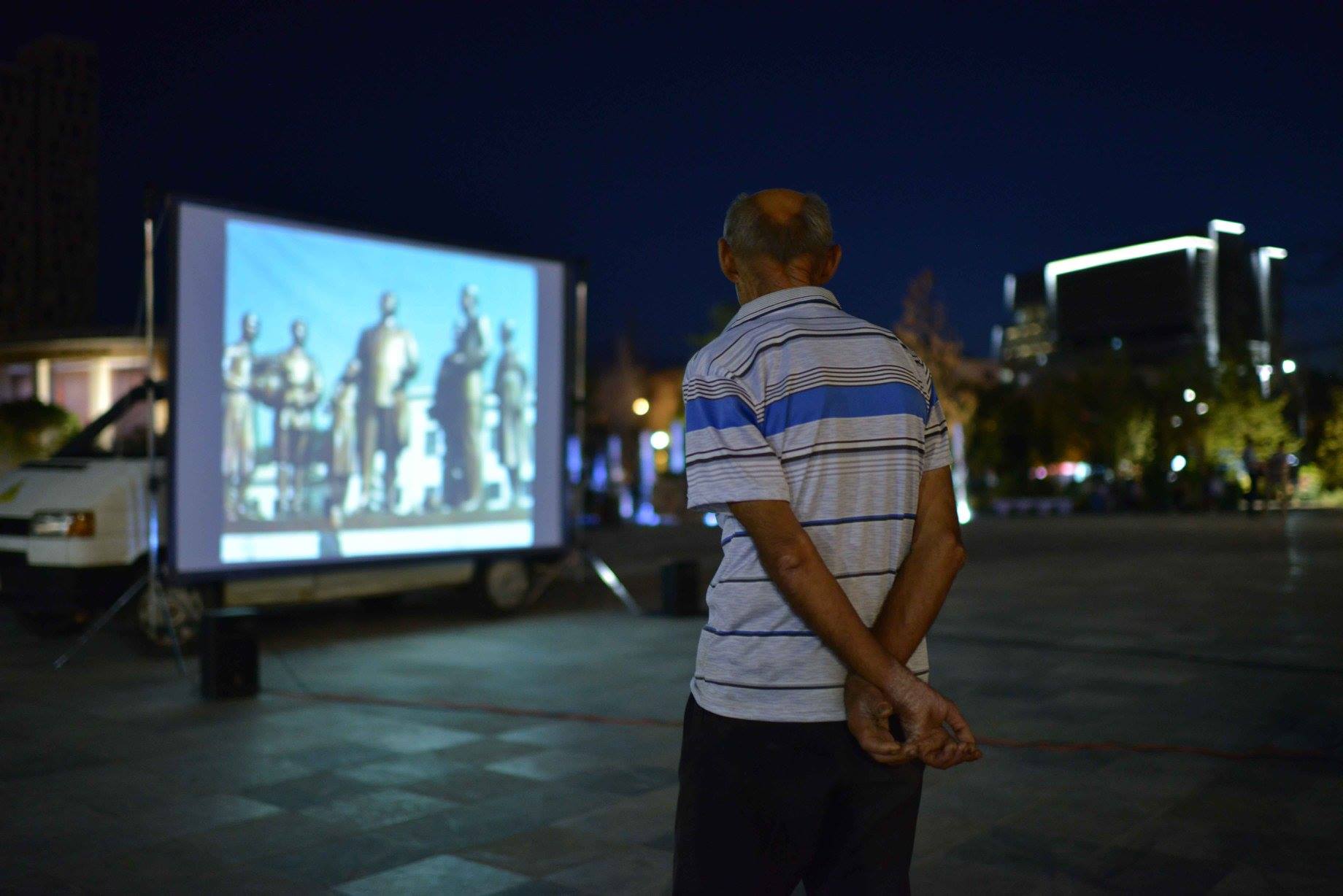 Festival attendee, watching a screening of the Polish film "Defilada – The Parade" at the Scanderbeg Square, Tirana, 18 September, 2017.