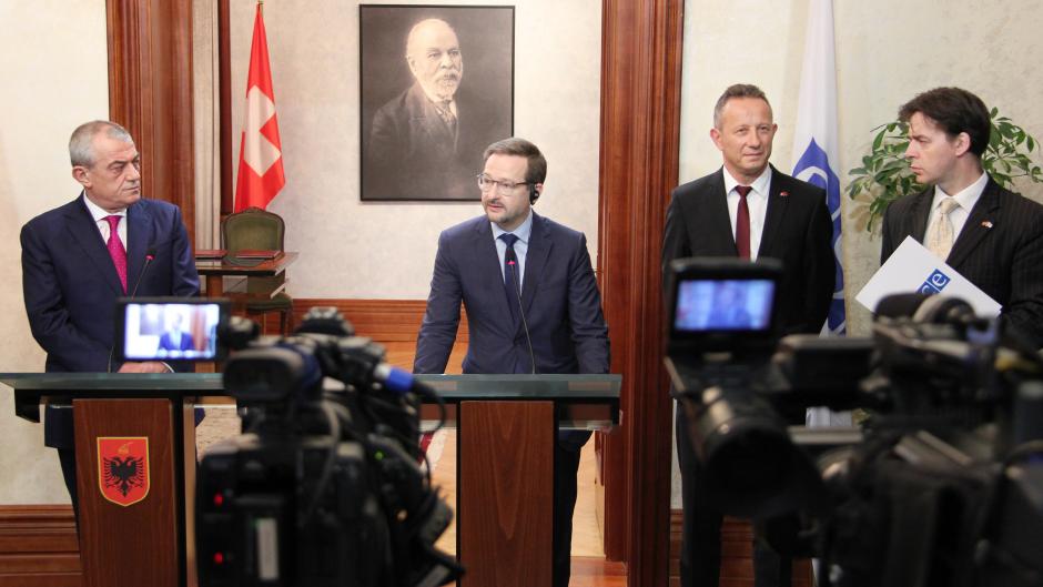 (l-r) Speaker of the Parliament of the Republic of Albania Gramoz Ruçi, OSCE Secretary General Thomas Greminger, Swiss Ambassador to Albania Christoph Graf, and Deputy Head of the OSCE Presence in Albania, Robert Wilton, talk to the media after a meeting, Tirana, 29 May 2018.