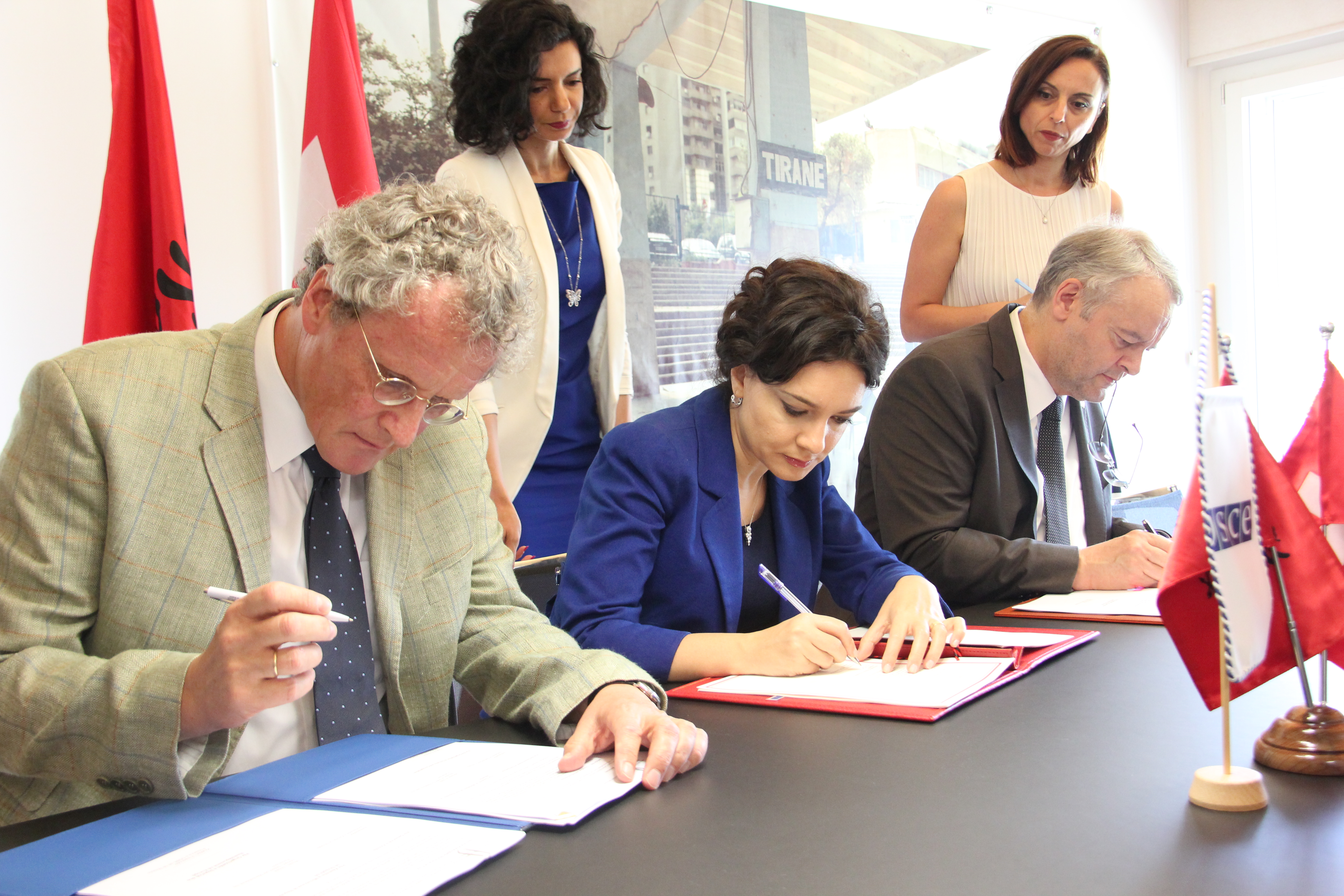 (l-r) Head of the OSCE Presence in Albania Ambassador Bernd Borchardt, Albania’s Minister of State for Relations with Parliament Elisa Spiropali, and Swiss Ambassador to Albania Adrian Maître sign an agreement on support to parliament and civic education, Tirana, 18 June 2019.