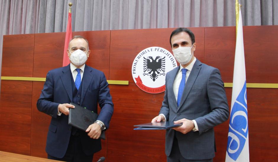 Head of the OSCE Presence in Albania, Vincenzo Del Monaco (l), and Albania's General Prosecutor sign Memorandum of Understanding on future co-operation between the two institutions, Tirana, 13 April 2021.