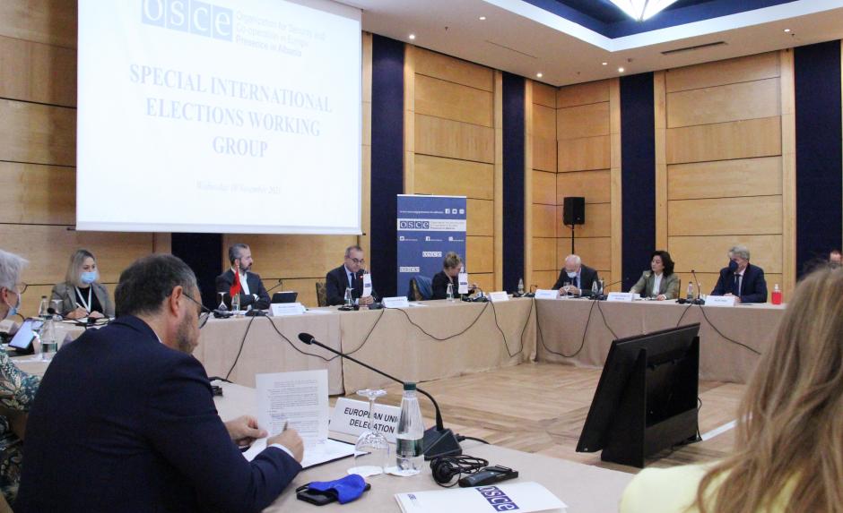 Ambassadors of OSCE participating States and international organizations in Albania discuss election-related topics with State Election Commissioner in a special meeting of the International Election Working Group organized by the OSCE Presence, Tirana, 10 November 2021.