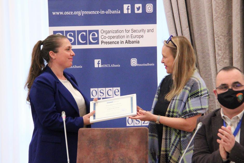 Journalist Anila Hoxha (l) - one of the three winners of OSCE Presence in Albania's competition for best investigative reports on corruption - receives the prize from Deputy Head of Presence Clarisse Pasztory, during 7th annual Media Development Forum, Tirana, 25 November 2021.