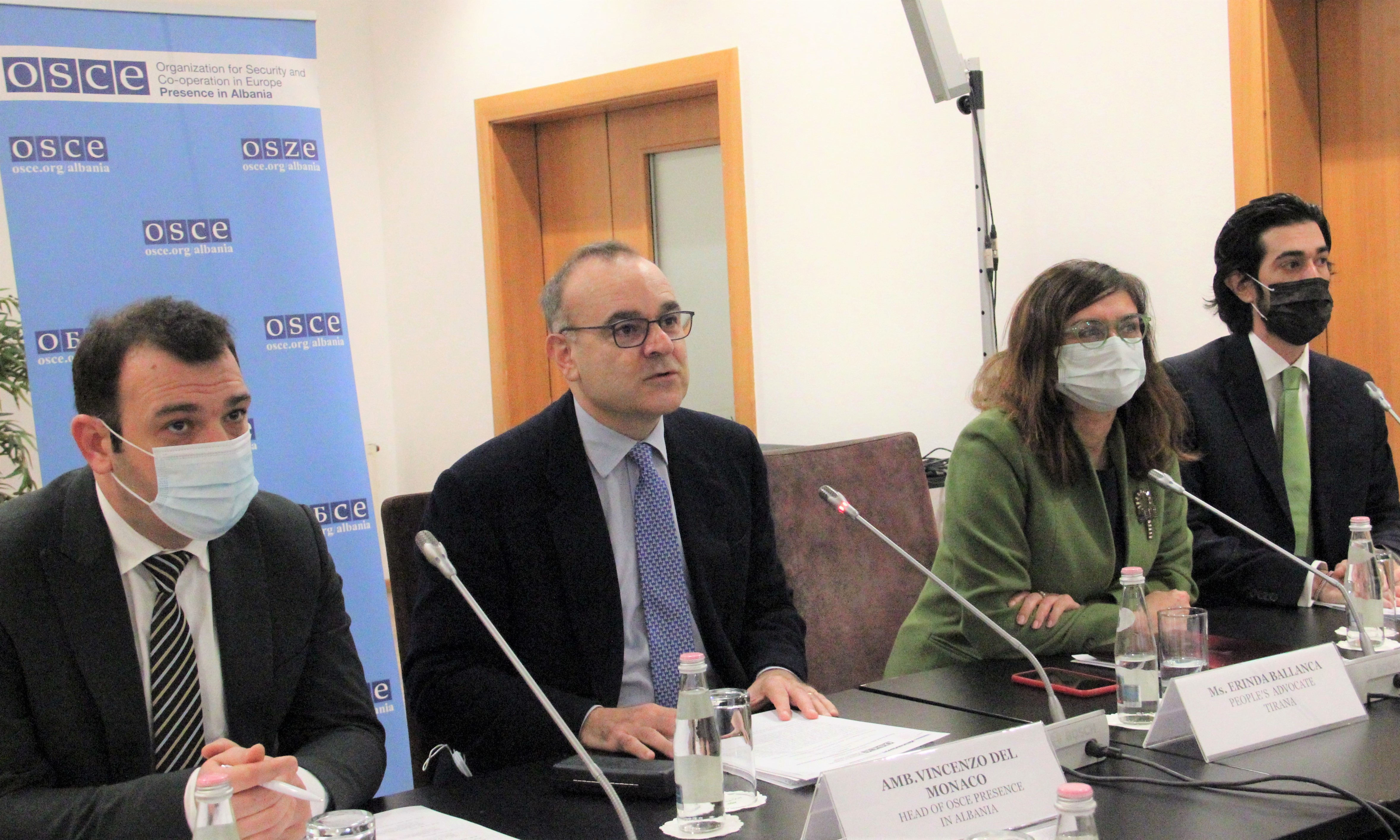 Head of the OSCE Presence in Albania, Vincenzo Del Monaco, addresses a regional roundtable of human rights institutions from Western Balkans, alongside People's Advocate Erinda Ballanca (r), and Commissioner from Protection from Discrimination Robert Gajda (l), Tirana, 9 December 2021.