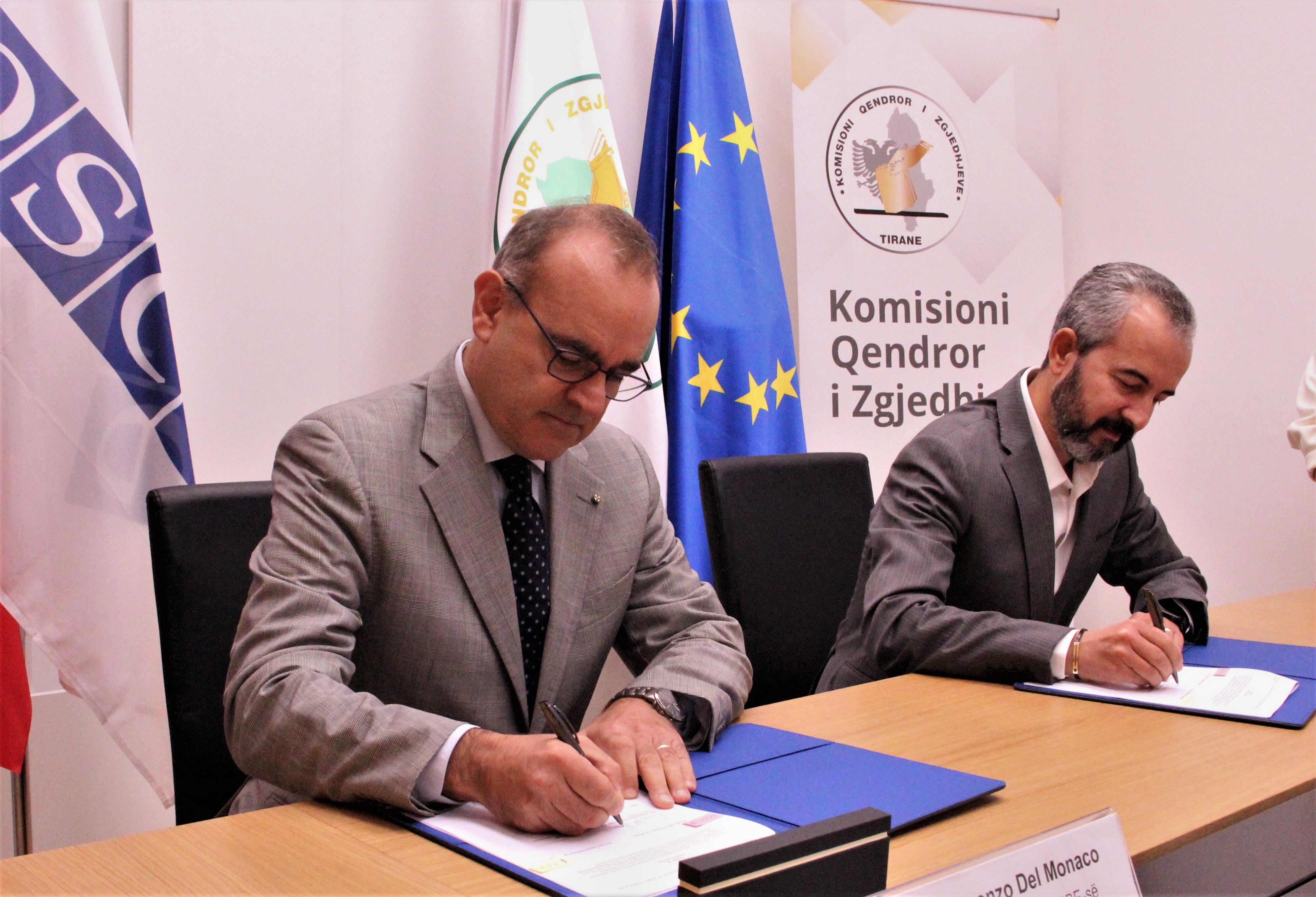 Head of OSCE Presence in Albania Ambassador Vincenzo Del Monaco (left) and Albania's State Election Commissioner Ilirjan Celibashi (right) signing a Memorandum of Understanding in Tirana.