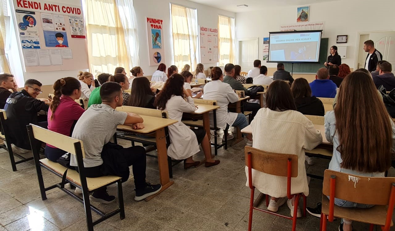 Children, parents, teachers, school psychologists and social workers participate in one of a series of information sessions on cyber security organized by the OSCE Presence in Albania, Lezha, 2 November 2022.