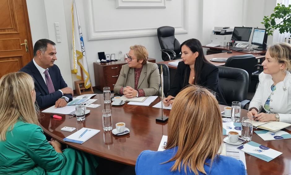 A delegation of Albania's National Bureau of Investigation headed by Director Aida Veizaj meets with General Director of Southeast European Law Enforcement Center Oğuz Serkant Akın as part of a three-day peer exchange visit to Romania organized by the OSCE Presence in Albania, Bucharest, 26 September 2023.