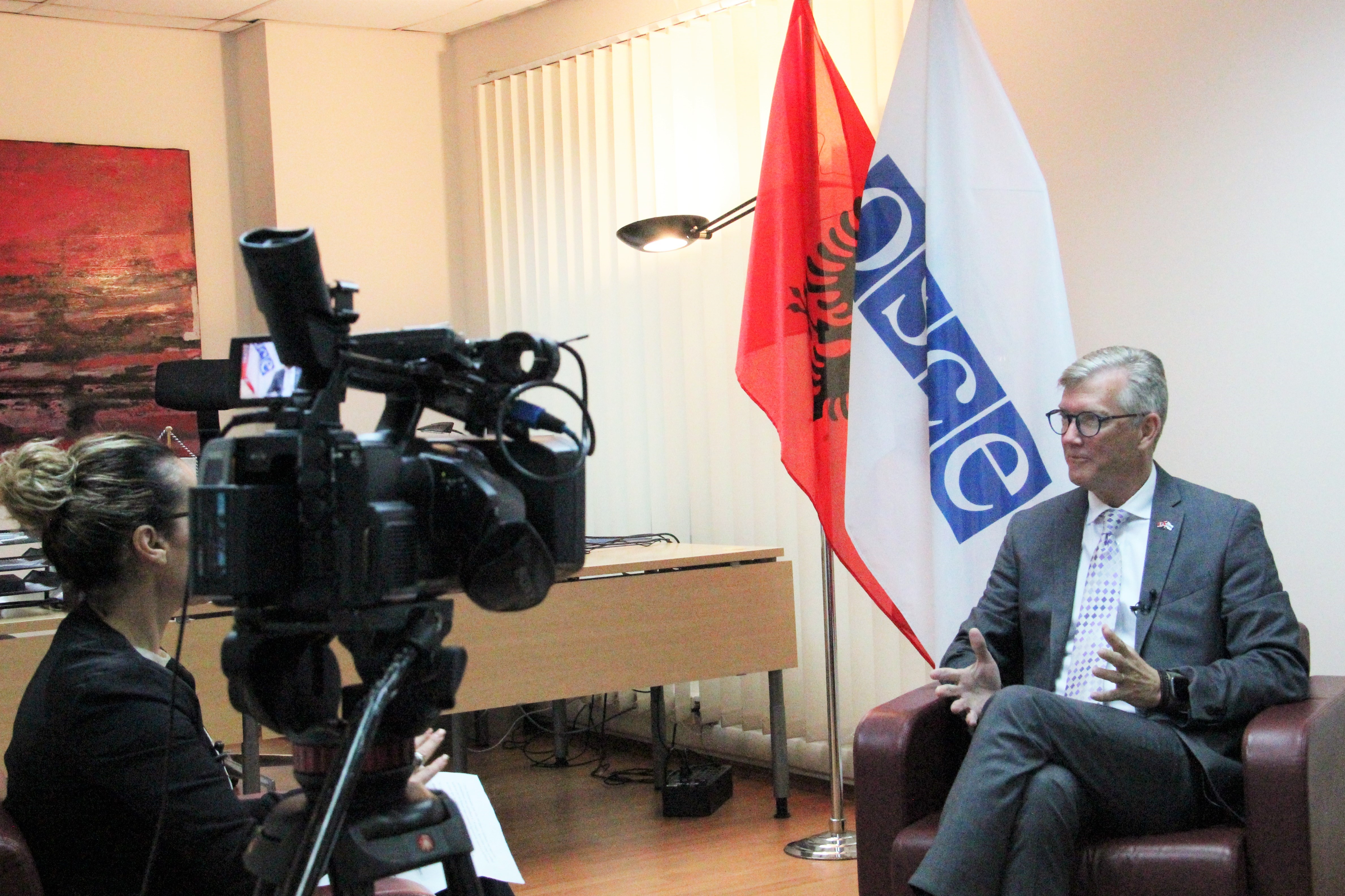 Ambassador Bruce Berton in his first interview with the Albania public Radio and Television as Head of the OSCE Presence in Albania, Tirana, 17 October 2023.