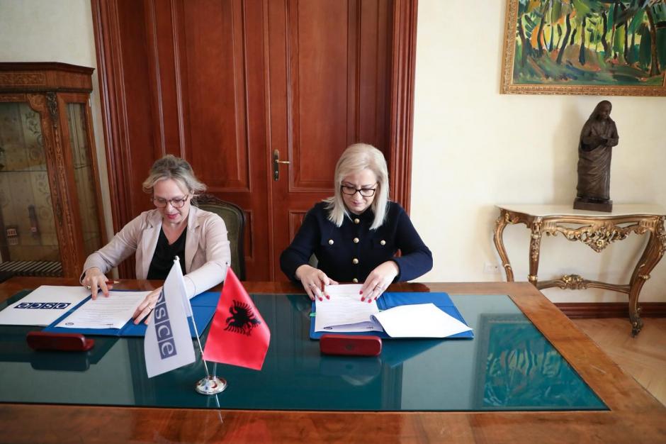 Acting Head of the OSCE Presence in Albania, Clarisse Pasztory (l) and Speaker of the Assembly of Albania Lindita Nikolla sign a Memorandum of Understanding to renew and strengthen partnership, Tirana, 20 March 2024.