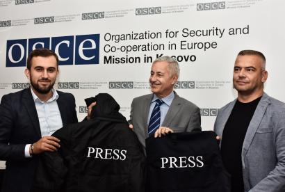 PRISHTINË/PRIŠTINA, 23 September 2016 – The outgoing Head of the OSCE Mission in Kosovo, Jean-Claude Schlumberger, hosted today the chairpersons of the Association of Journalists of Kosovo, Shkëlqim Hysenaj, and of the Journalists’ Association of Serbia registered in Kosovo, Budimir Ničić, to donate 50 sets of vests and jackets bearing the word ‘PRESS’...