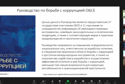 An OSCE-organized online seminar on best practices in preventing and countering bribery and corruption took place in Ashgabat from 23 to 24 June 2022. The purpose of the event was to present best practices of the OSCE participating States in developing measures to prevent and combat corruption