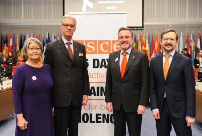VIENNA, 28 November 2019 – OSCE Secretary General Thomas Greminger presented two members of permanent delegations representing their countries in the OSCE with a White Ribbon Award in recognition of their personal commitment and achievements in promoting gender equality.