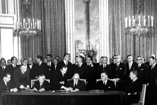 German Federal Chancellor Konrad Adenauer and French President Charles de Gaulle signed the Elysée Treaty, a cornerstone of post-war reconciliation in Europe, in Paris on 22 January 1963.