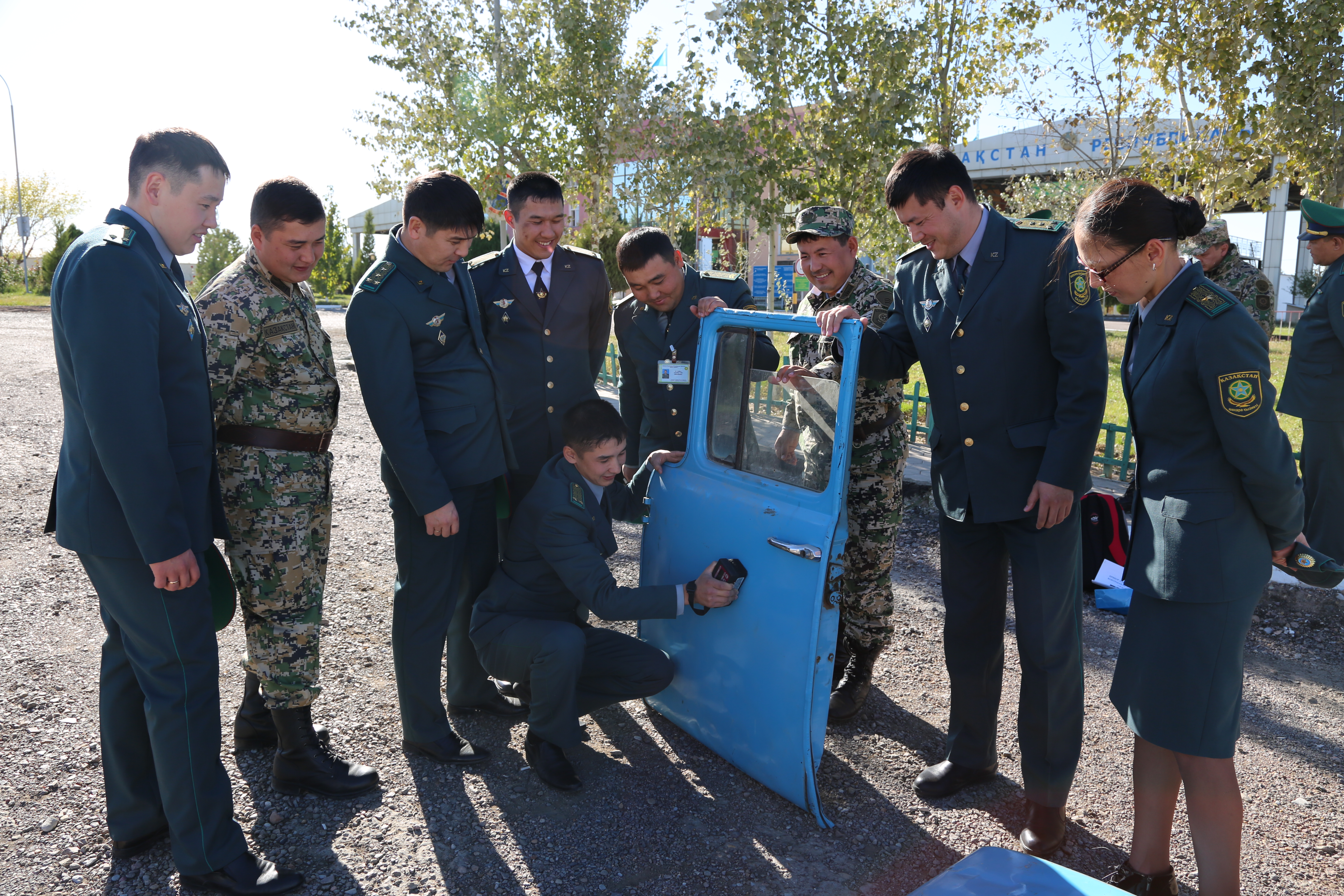 Border Guards from Kazakhstan test out the density meter “Buster” on a car door during a practical exercise in Kazygurt, 26 October 2015.