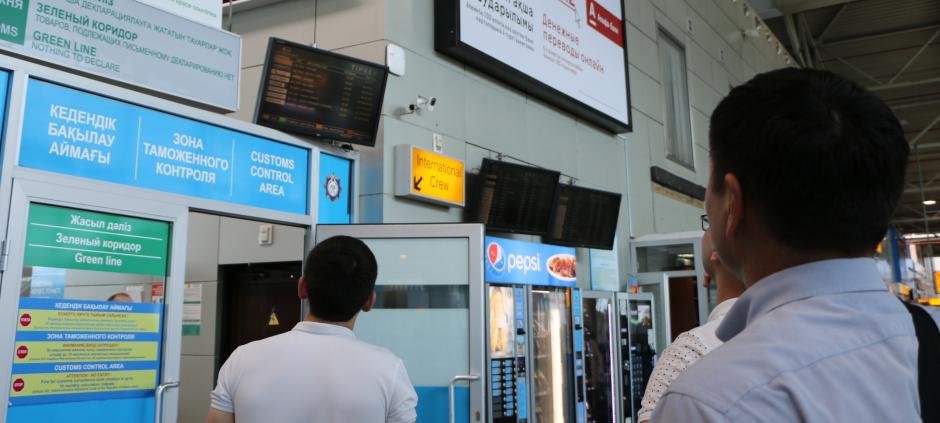 Participants of the training event are identifying a high-risk departure flight in order to develop a risk profile, Almaty, 30 March 2017.