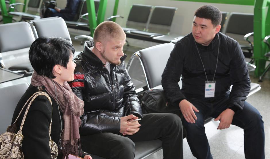 Border guards are interviewing a person instructed to behave as a suicide bomber using newly acquired skills during a practical exercise at the Astana International Airport, Astana, 6 April 2017.