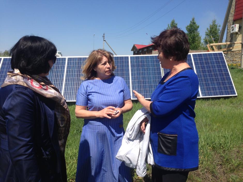 Participants of the green technology workshops for women entrepreneurs discussing the key principles of solar panels, Kostanai, 18 May 2017.