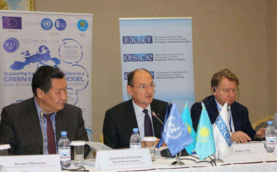 Ambassador György Szabó (centre), Head of the OSCE Programme Office in Astana, speaks at the opening of the roundtable, Astana, 15 November 2017.