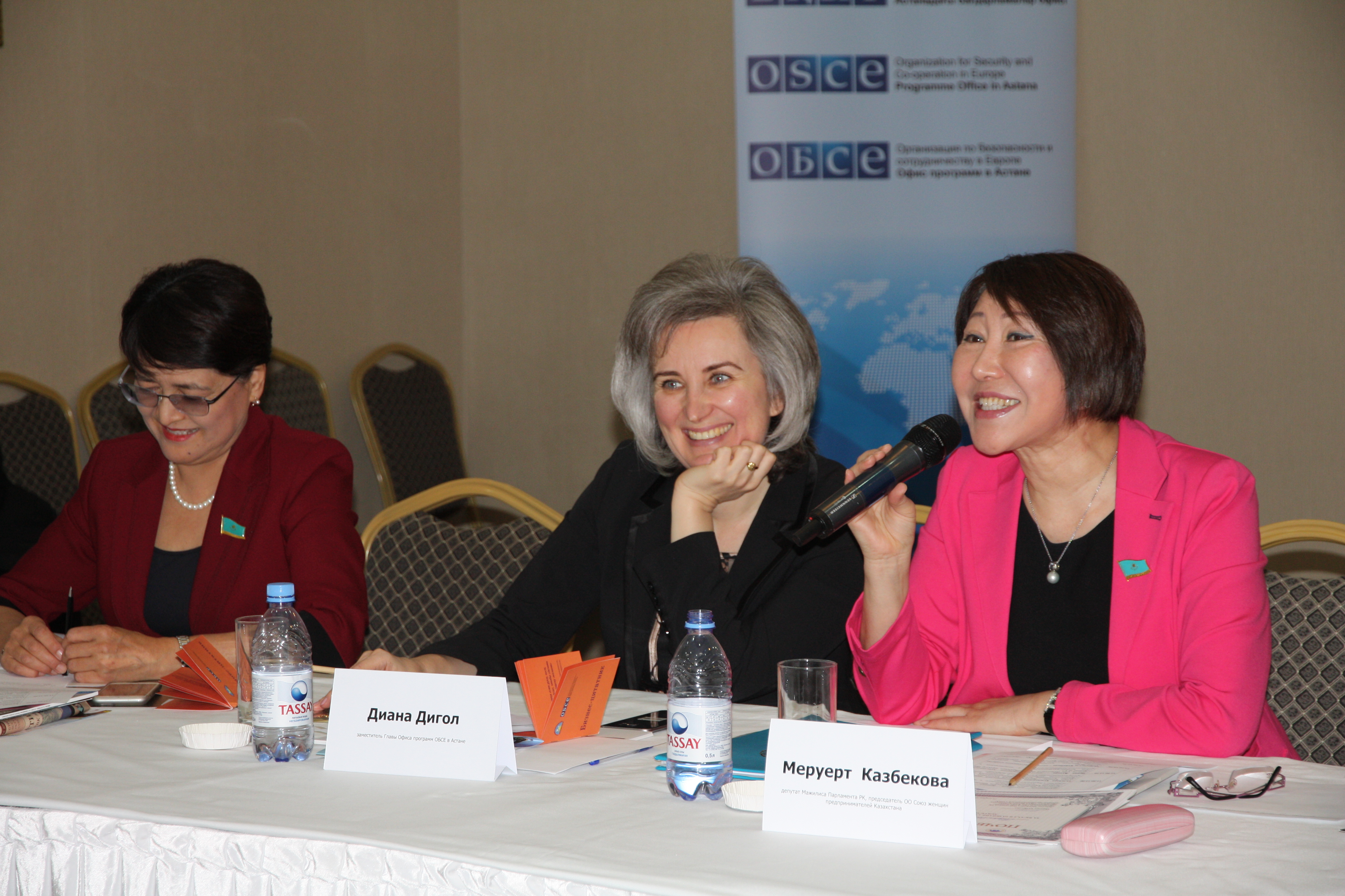 Maira Asina, Parliament Member (l), Diana Digol, Deputy Head of the OSCE Programme Office in Astana (c), and Meruert Kazbekova, Parliament Member and Women Entrepreneurs’ Union Chair (r), at an OSCE-supported roundtable on the economic empowerment and political participation of women, Astana, 28 November 2017.