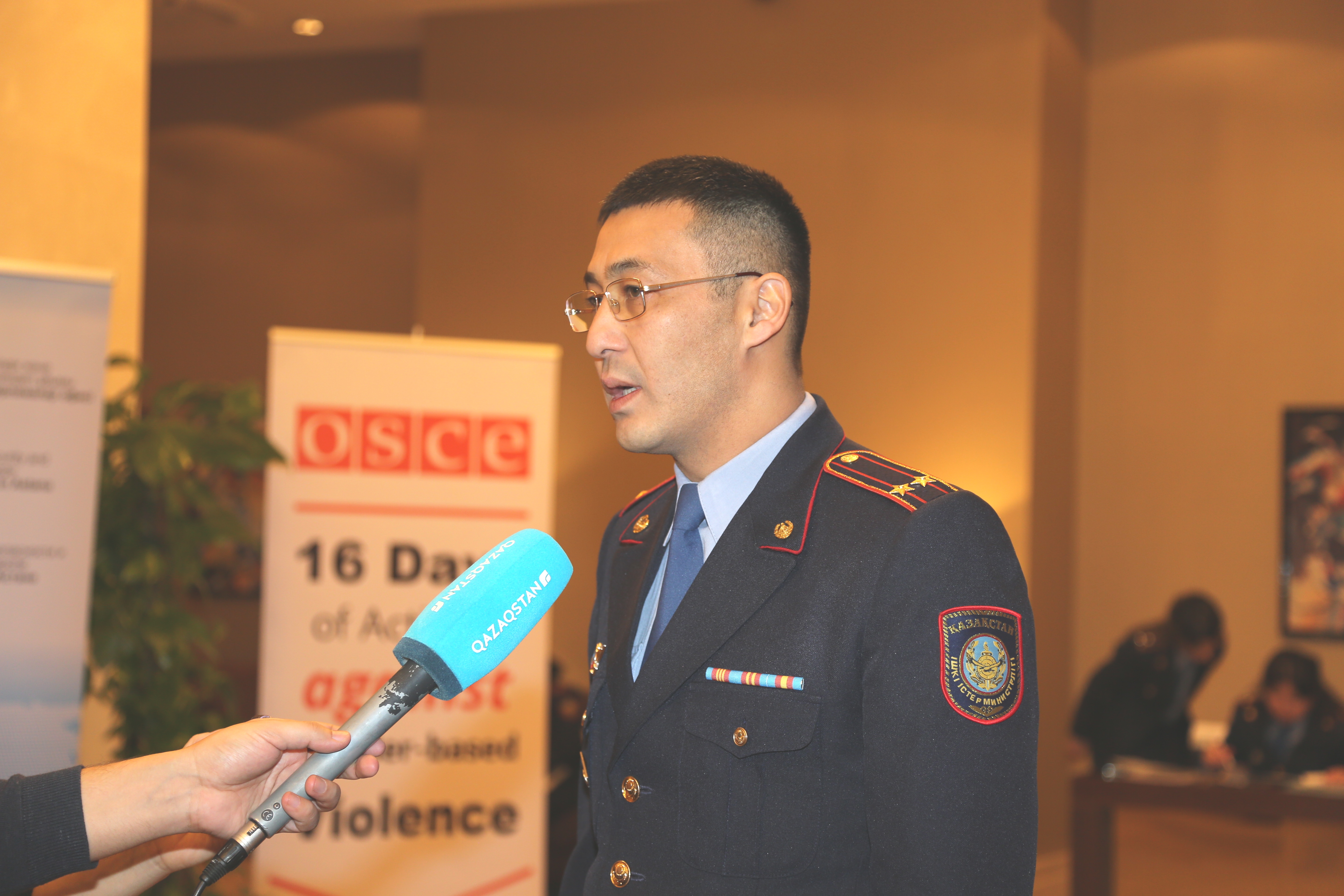 Kenzhebek Kospayev, Deputy Head of the Department of Internal Affairs of the West Kazakhstan Region, is sharing the results of the OSCE supported project on the community police work in combating domestic violence, Astana, 30 November 2017.