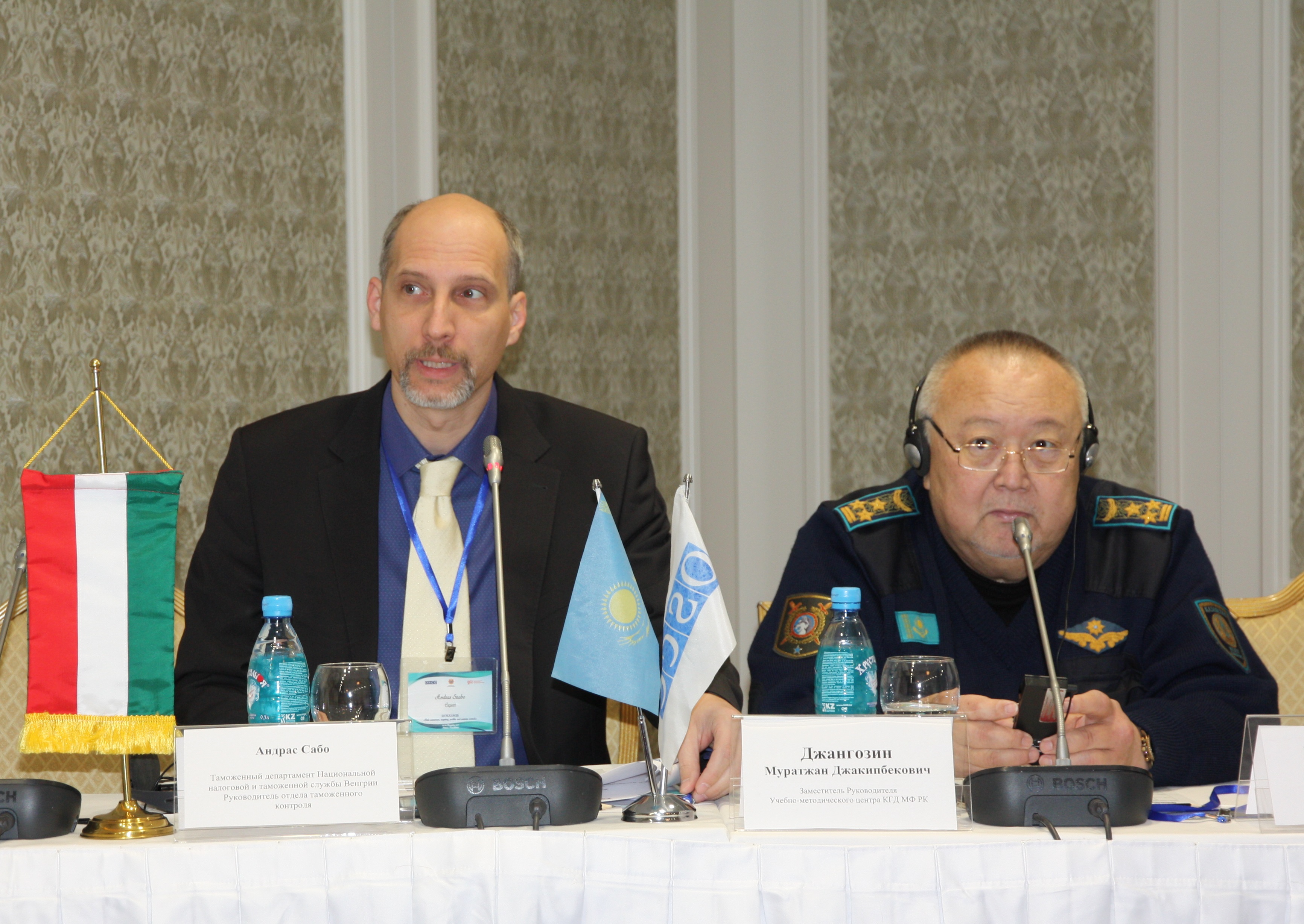Andras Szabo, Head of Customs Control Unit, National Tax and Customs Administration of Hungary (l), and Muratzhan Dzhangozin, Deputy Head of Training Centre under State Revenue Committee of the Ministry of Finance (r), share their experience on efficient custom risk management, Astana, 30 November 2017.