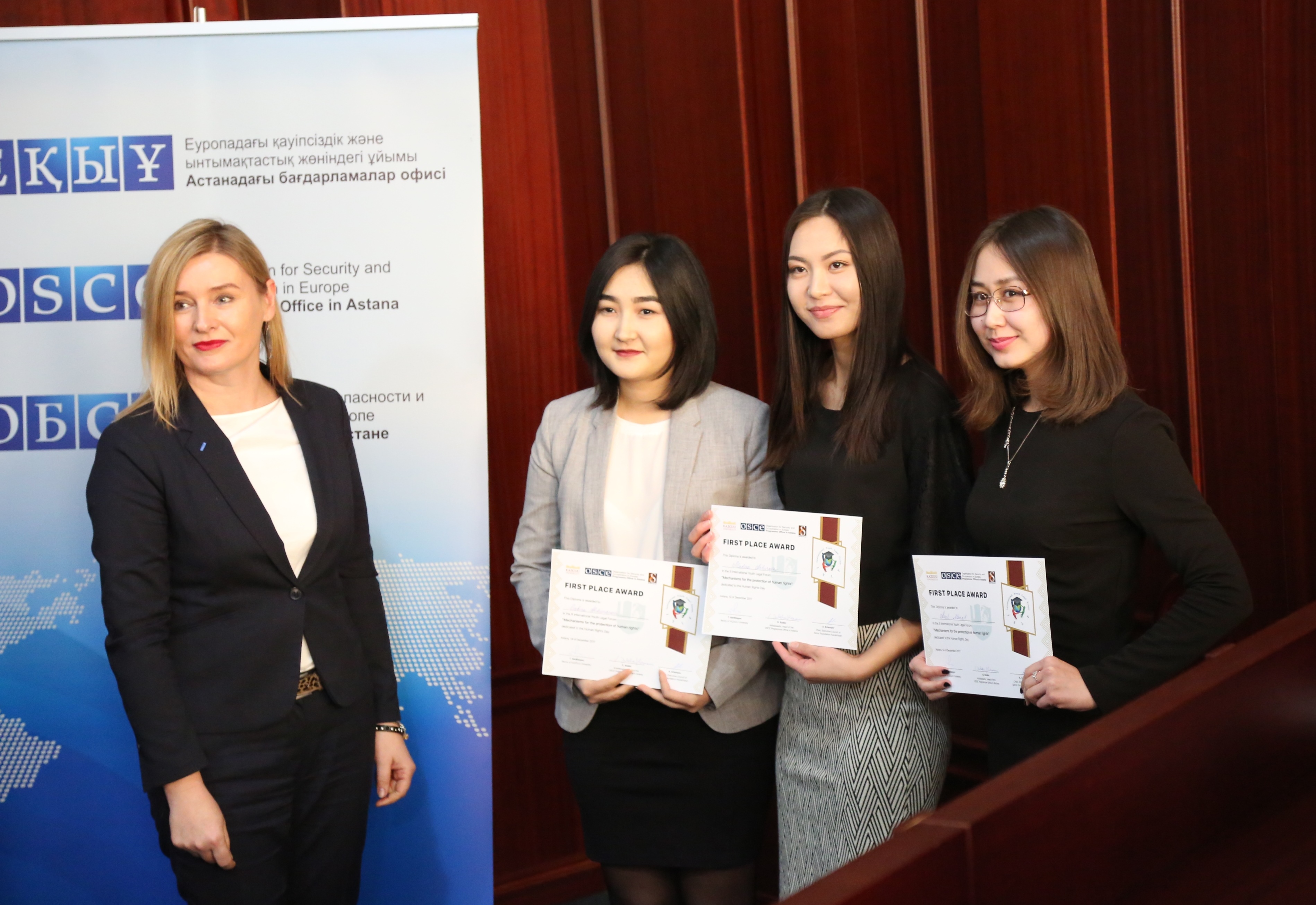 Izabela Sylwia Hartmann, Human Dimension Officer of the OSCE Programme Office in Astana together with the winners of the students' competition at the International Youth Legal Forum, Astana, 14 December 2017.