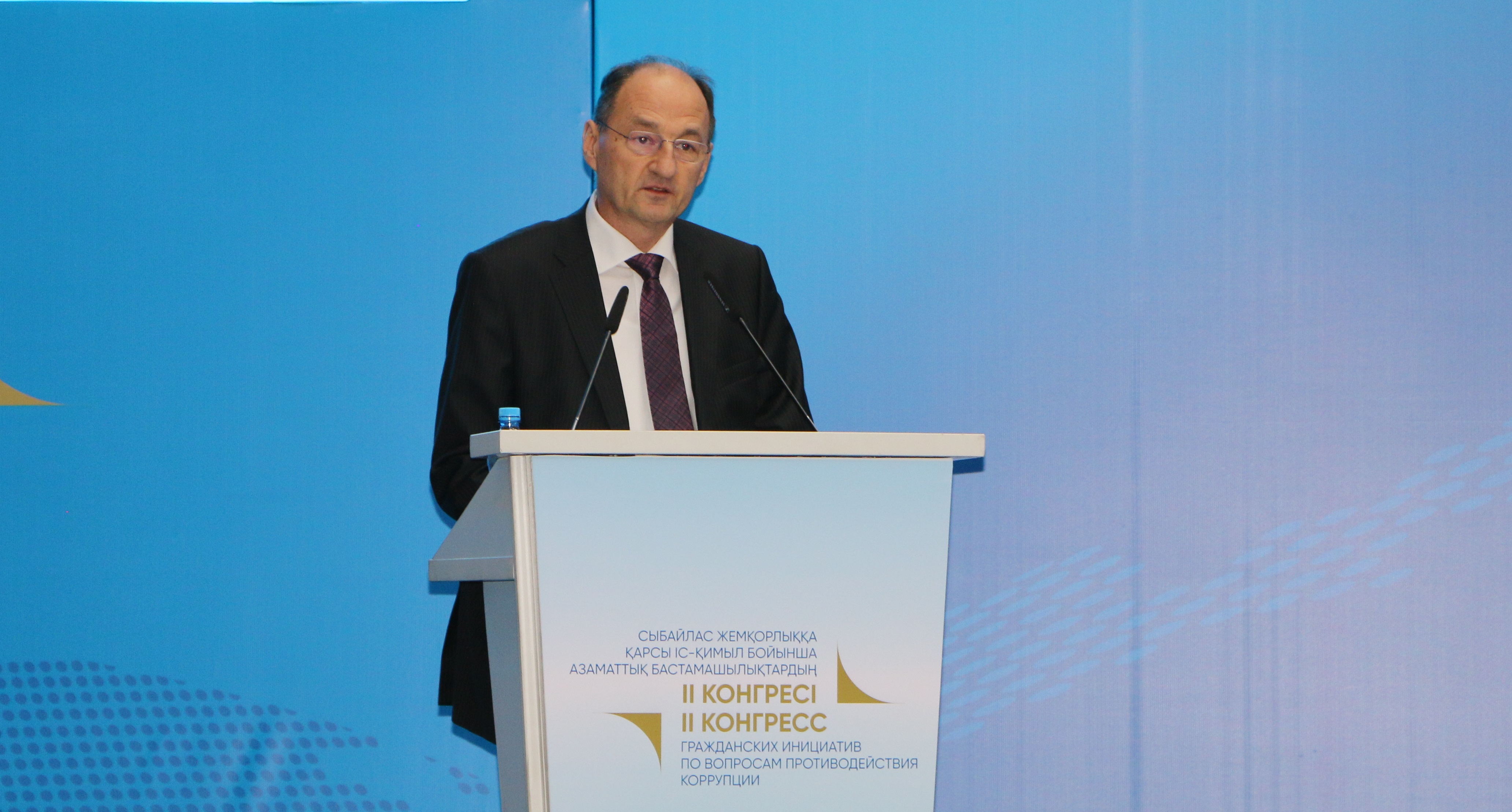 Ambassador György Szabó, Head of the OSCE Programme Office in Astana, speaks at the opening of the II Congress of Civil Initiatives for Combating Corruption, Astana, 14 March 2018.