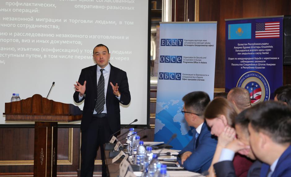 Zhangali Kenbayev, Head of the Educational Center on Combating Illegal Migration and Human Trafficking of the Karaganda Police Academy, presenting on the current situation of human trafficking issues in Kazakhstan, Shymkent, 31 May 2018.