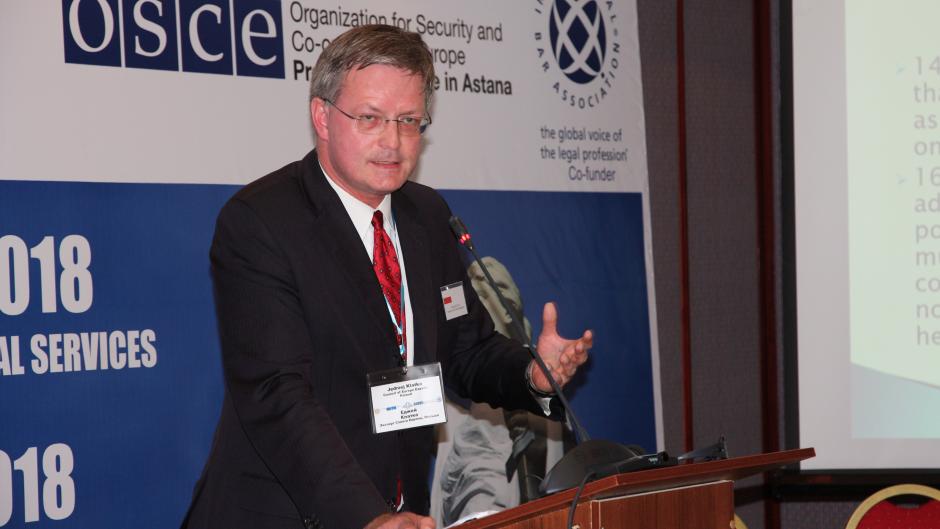 Expert Jedrzej Klatka speaking about the rules of ethics at the advocates conference, Almaty, 15 June 2018.