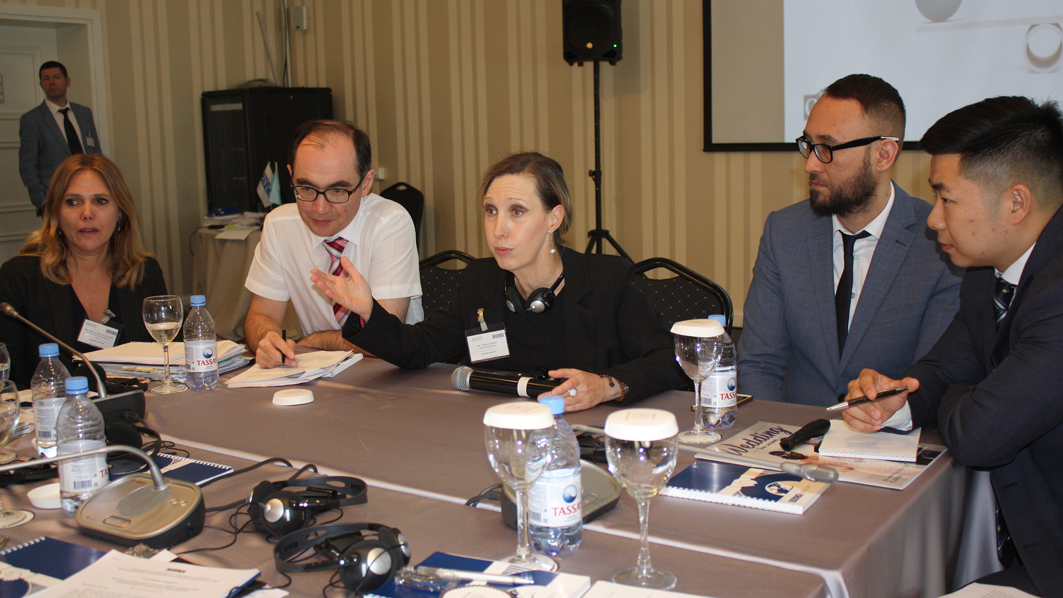 Teresa Albano (c), Economic Affairs officer for the OSCE, speaks at an event on labour migration practices in Central Asia, Almaty, 26 June 2018.