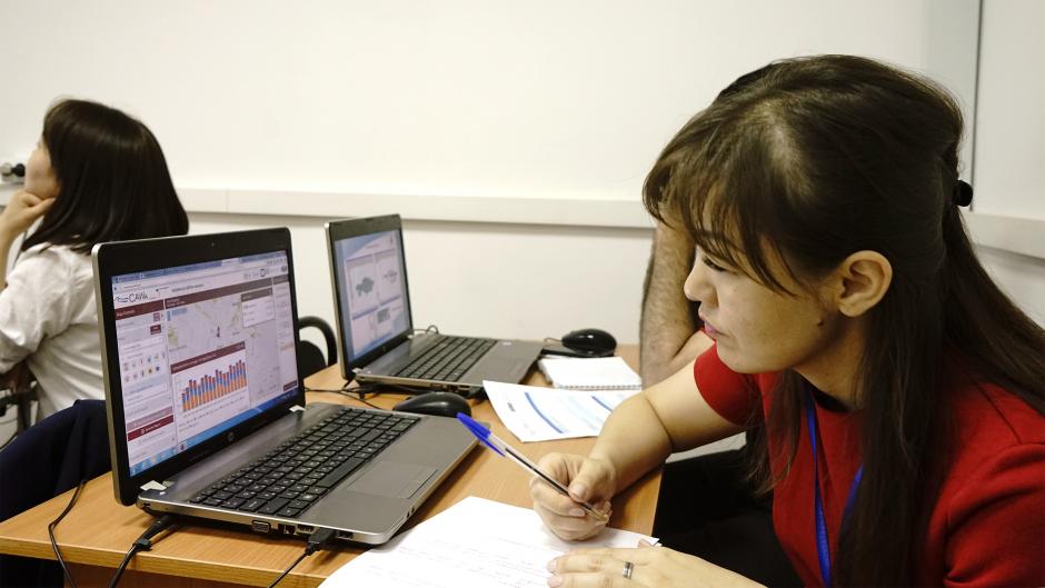 Summer school participant using a tool for monitoring water use efficiency, Almaty, 11 June 2018.