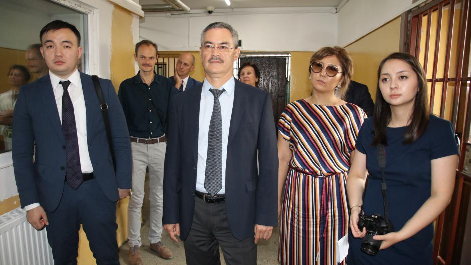 Head of the National Centre for Human Rights Serik Ospanov (centre) during a visit to a pre-trial detention facility in Warsaw-Bialolenka, 10 August 2018.