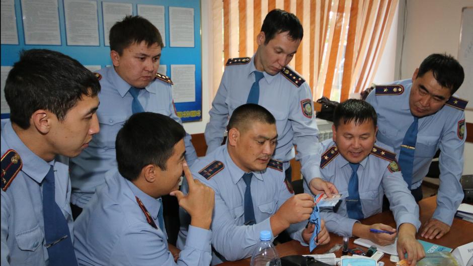 Participants of the training-seminar are identifying illegal items in a passenger's luggage to develop a risk profile, Aktobe, 14 September 2018.