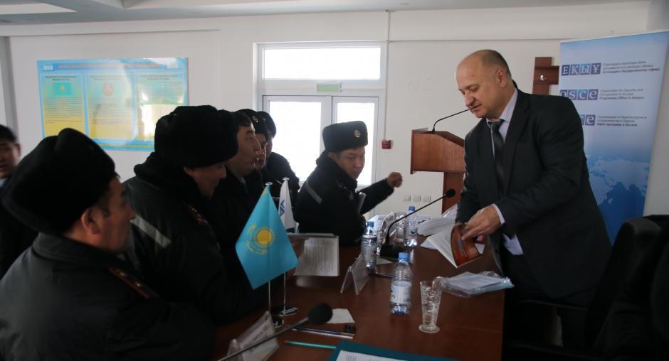 The events were organized by the crisis centre ‘Podrugi’ and the Ministry of Internal Affairs (MIA) of the Republic of Kazakhstan with the support of the OSCE Programme Office in Astana. Together with two national experts, 209 community police officers discussed best practices in preventing and addressing domestic violence. The events, along with other upcoming training seminars in the Akmola, Aktobe and Zhambyl regions, aim at building the capacity of police inspectors who respond to calls on possible domestic violence cases.