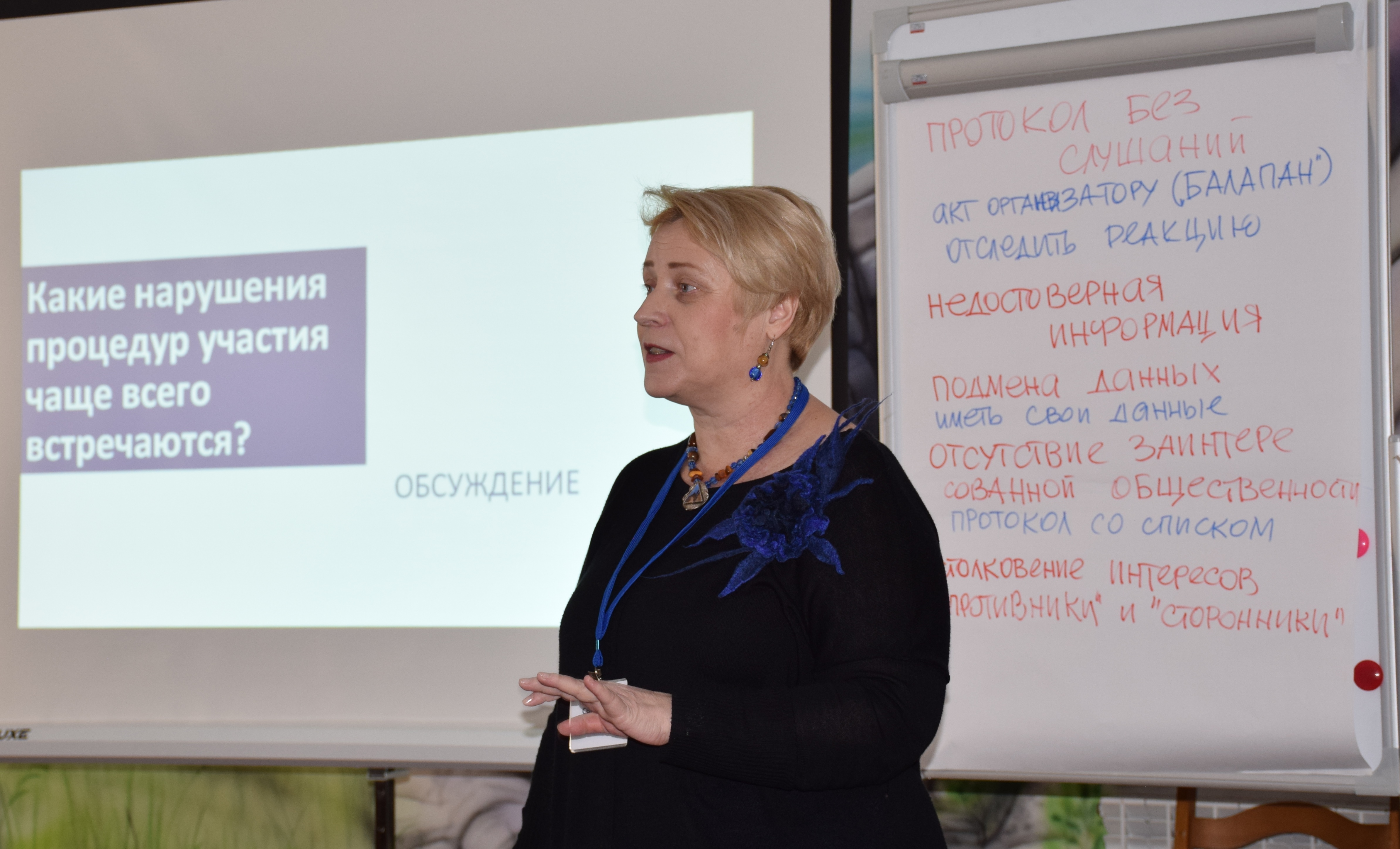 Svetlana Mogilyuk, Head of the Pavlodar Aarhus Centre, speaks on the existing problems in public participation, Pavlodar, 23 February 2019.