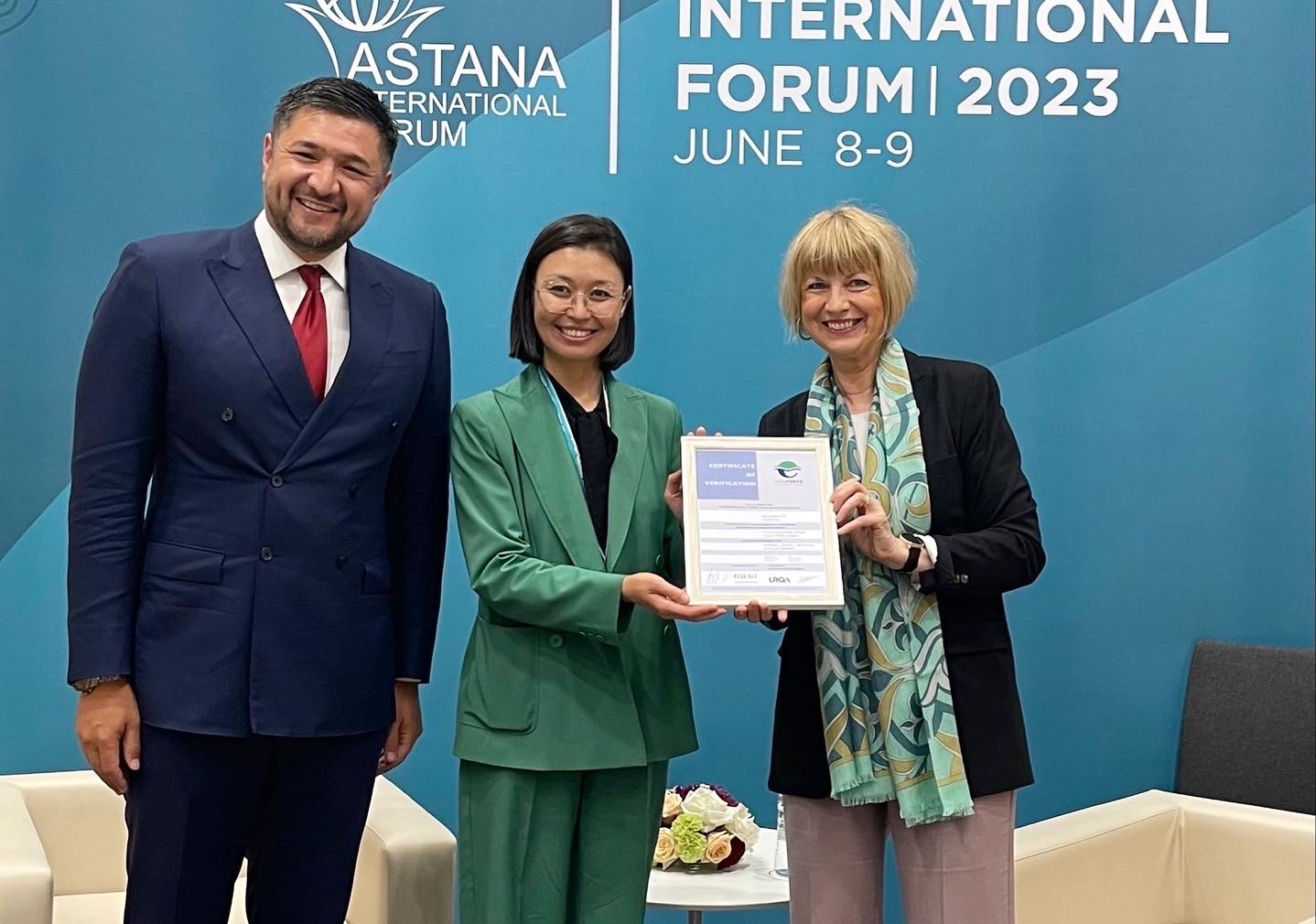 OSCE Secretary General Helga Maria Schmid presents the Eco Ports certificate for the port of Kuryk to the Minister of Ecology of the Republic of Kazakhstan Zulfiya Suleimenova and the Director of the port Akhmetov Serik, Astana, 8 June 2023.