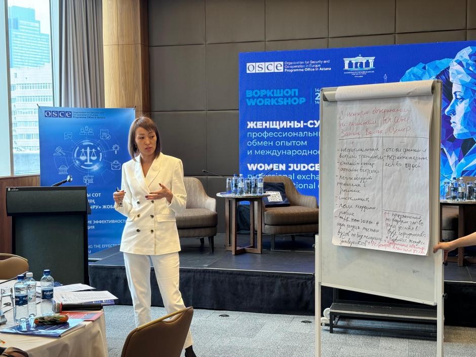 Judge Rsaldy Kakisheva presenting on advantages of creating a women judges association during the interactive session of the workshop for women judges, Astana, 14-15 March 2024