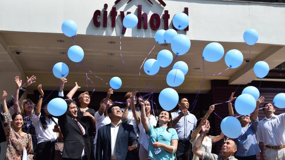 Participants from the round table discussion launch blue balloons to mark the World Day against Trafficking in Persons, Bishkek, 28 July 2017.
