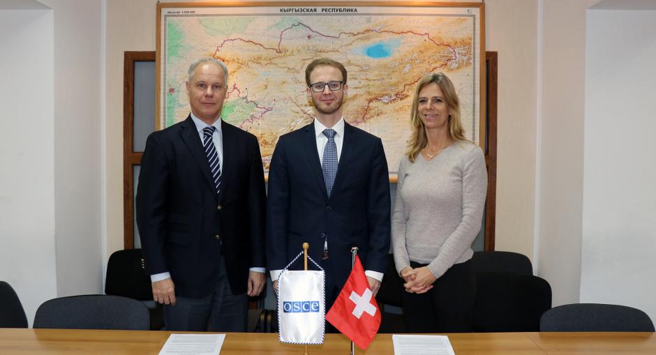 Pierre von Arx (l), Head of the OSCE Programme Office in Bishkek, Alexander Wolters, Director of the OSCE Academy and Ambassador Véronique Hulmann of the Swiss Embassy in Bishkek.
